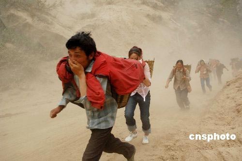 汶川重灾区仍然余震,崩塌、滑坡、泥石流等地质灾害险情不断,被困受灾群众由抢险部队协助安全撤离。图为5月20日,汶川受灾群众快速通过山体滑坡险段。中新社发 陈文 摄