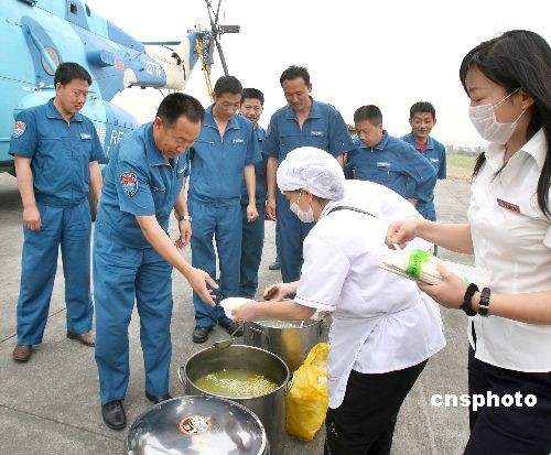 5月20日,成都市某企业职工给战斗在抗震救灾一线的南空某团官兵送在热气腾腾的老鸭汤。