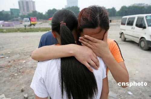 5月20日中午12时20分,在北川中学学生临时安置点,李春榕找到了寻找了六天的姐姐的女儿——北川中学初一六班的杨晓丹,在得知父母已不在人世时,杨晓丹与小姨相拥而泣。中新社发 刘震 摄
