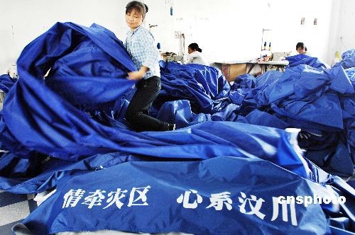 5月20日,浙江杭州一雨具制品厂的女工们在日夜赶制灾区急需的救灾专用帐篷。据了解, 该厂急灾区所急,放弃其他雨具生产,每天开足马力生产帐篷,产量达300顶,比平时增加一倍,并实行微利销售。目前已有2000多顶救灾专用帐篷送往四川、陕西等地震重灾区。