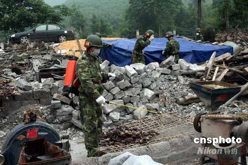 为防止灾后发生疫情,中国空降兵某团进村入户之后及时进行防疫,采取宣传防疫知识,喷洒药物等形式,消灭死角,确保受灾民众身体健康。图为5月24日,官兵在喷洒药物。中新社发 谭超 摄