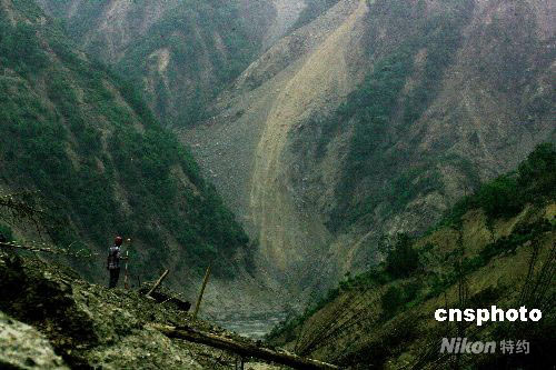 图:科技人员塌方中测量唐家山堰塞湖