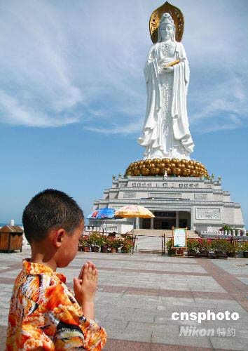 5月26日,参加“为灾区孩子疗伤——爱心海南游”的9名来自四川绵阳安县、都江堰地区的地震受灾儿童在三亚南山文化旅游区游玩。这9名孩子都是暂时无家可归,而到海南来投亲靠友的。他们在心理辅导志愿者的陪伴下,于当日开始他们为期3天的海南之旅。中新社发 陈文武 摄