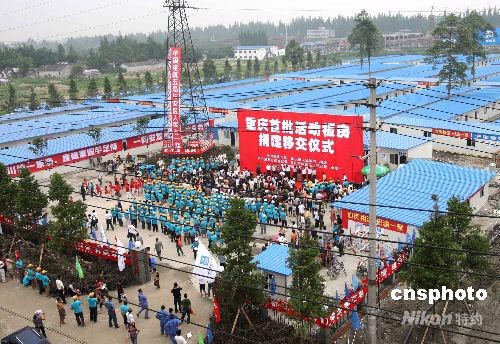 由重庆市政府捐助、南岸区承建的一万平方米、500套轻型结构活动保暖住房5月27日在四川都江堰落成,数千都江堰受灾民众将于近日入住,成为“重庆村”一员。中新社发 赵振清 摄