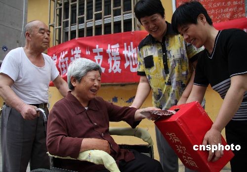5月27日,退休老人张世俊(左一)推着老伴来到捐款站,把节俭下来的5000元钱投进捐款箱。这是老夫妻俩第三次为地震灾区捐款献爱心。汶川大地震发生后,张世俊、李爱玲夫妇先后三次把省吃俭用的2万元钱捐给地震灾区,在当地被传为佳话。中新社发 吉 喆 摄