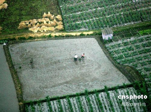 五月下旬, “天府之国”四川成都正值抢收小麦油菜和抢种水稻的关键时刻,受灾农民一边防震一边辛勤劳作。中新社发 贾国荣 摄