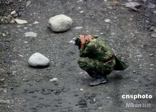 汶川大地震发生十五天以来余震不断,一位抢险的士兵突遇滑坡,果断蹲地减少人体面积,同时用双手牢牢保护头部,终于化险为夷。中新社发 贾国荣 摄