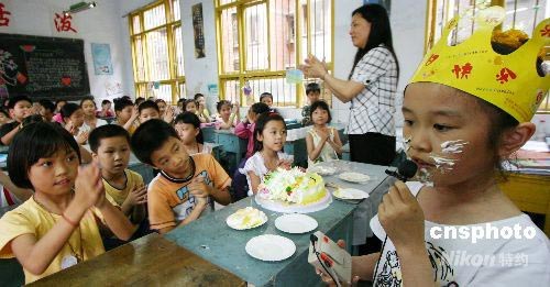 5月28日,重庆市永川区萱花小学三.三班全体同学为来自四川省江油灾区的段明阳过了个简单而隆重的生日,同学们分批次地把自己亲手做的生日礼物送给段明阳,并祝她生日快乐。段明阳向全班同学清唱了一首《装扮蓝色的地球》表谢意,并一一把生日蛋糕喂给同学们,期望能尽早地融入到新的集体里。中新社发 陈仕川 摄