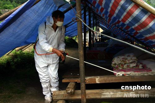 5月28日,为了防止大灾之后出现大疫,卫生防疫已进入地震灾区家家户户。图为防疫人员在汶川大地震重灾区之一的彭州白鹿镇喷洒消毒药剂。中新社发 杨杰 摄