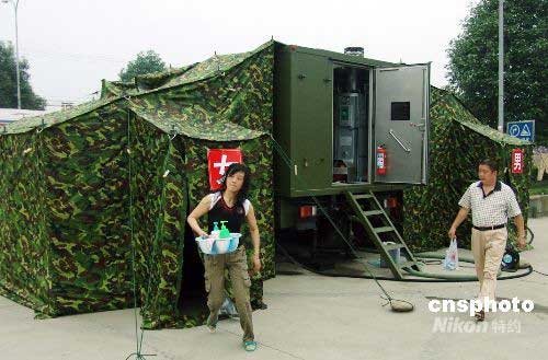 5月29日,受灾群众从淋浴车里走出来。当日,济南军区某部将野战淋浴车开进了都江堰市滨河社区群众安置点,提供便民服务。据了解,滨河社区安置点现有受灾群众3000多名,为了使灾区群众能尽快洗上热水澡,官兵把淋浴车开到安置点,将储水罐蓄满水,并仔细调试了设备。中新社发 梁志杰(部队) 摄