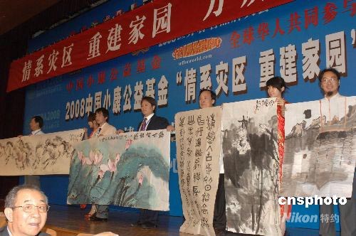 6月15日,百名画家在北京全国人大会议中心出席2008中国小康公益基金“情系灾区、重建家园”推动大会暨中国当代百名画家赈灾义捐献爱心活动。该活动是由文化部中华社会文化基金会、中国小康公益基金、美中经贸投资总商会、世界著名品牌大会等单位共同主办。“中国小康公益基金”由文化部中华社会文化发展基金会组建。中新社发 邹宪 摄