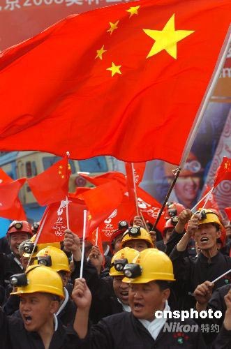 6月27日,奥运圣火在山西大同市传递,大同煤矿工人喜迎火炬。中新社发 华山大 摄