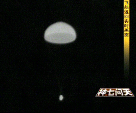 9月28日,神舟七号飞船返回舱主降落伞打开。