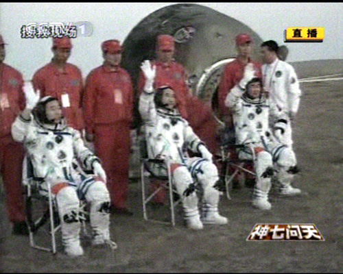 9月28日,神舟七号飞船返回舱顺利着落,三名航天员翟志刚、刘伯明、景海鹏在经过15-20分钟的重力再适应后全部出舱。首先出舱的是翟志刚,第二个出舱的是刘伯明,第三个出舱的是景海鹏。