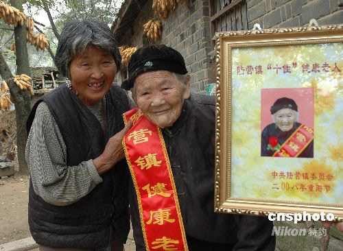 10月7日,河南省南阳市朱屯村101岁的曾广兰接过自己的节日照片。10月7日是一年一度的重阳节,河南省南阳市卧龙区陆营镇为评出的10名90岁以上的“十佳健康老人”送去了照片匾牌和重阳节礼物,表达对老人的节日祝福。中新社发 熊运彬 摄