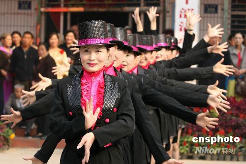 10月7日,河南许昌100多位退休老人欢聚一堂,在“庆祝九九老人节”文艺表演活动中载歌载舞,尽情展示自己的快乐和自信。中新社发 牛书培 摄