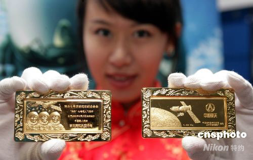 10月9日,为纪念神舟七号成功发射和中国首次太空行走圆满成功,作为国家纪念 “神七”飞天活动的重要组成部分,中国航天部门首次面向全球发行“金镶钻神七金条”。“金镶钻神七金条”分45克、90克、300克和1000克四种规格,全部采用999纯黄金制作,正面的主体图案为三位宇航员肖像,背面为神七飞船和宇航员出舱行走的风姿,这在中国航天史上尚属首次。中新社发 赵隽 摄