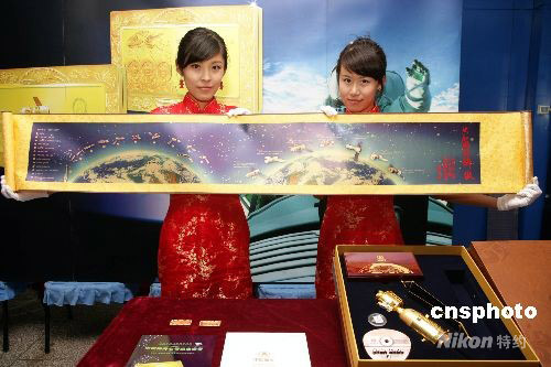 图为工作人员展示为配合“神七”纪念金条发行的一幅1.6米神舟七号载人航天飞行纪念纯金藏卷。
