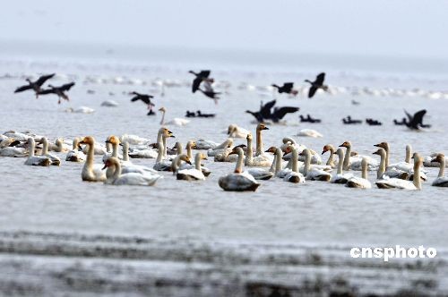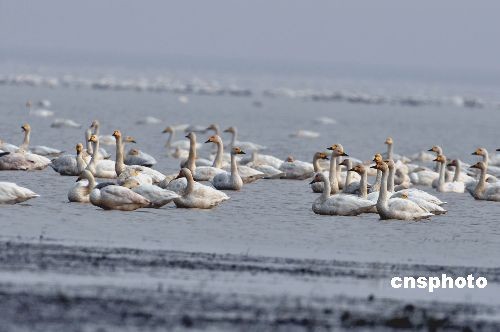 十二月十四日,数万只小天鹅、雁类等珍禽候鸟在鄱阳湖候鸟保护区江西星子县沙湖山沙湖池越冬栖息。入冬以来,中国第一大淡水湖江西鄱阳湖区八大湖池越冬栖息的珍禽候鸟总数已逾过十万只,包括白鹤、白鹳等国家一级保护鸟类,以及雁类、鹬类、小天鹅、野鸭等珍禽候鸟。目前每天仍有众多候鸟从中国北方等地陆续飞抵鄱阳湖越冬。中新社发 段长征 摄