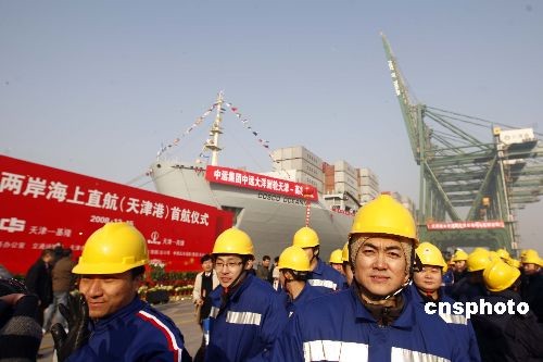 12月15日,海峡两岸海上直航首航仪式在天津市天津港举行。据悉,当日举行首航仪式的,大陆有天津、上海、太仓、福州、厦门、泉州6个港口,台湾有基隆、高雄2个港口,参加首航的船公司13家,其中大陆9家公司15艘船舶,台湾4家公司5艘船舶。中新社发 盛佳鹏 摄