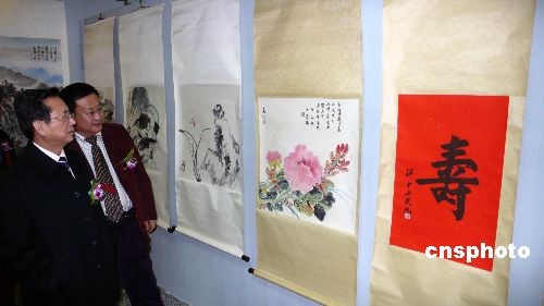 “两岸文化交流展暨文化创意产业论坛”十九日在北京开幕,展出了蒋介石、宋美龄、马英九、连战等两岸名流的书画作品。中新社发 徐长安 摄