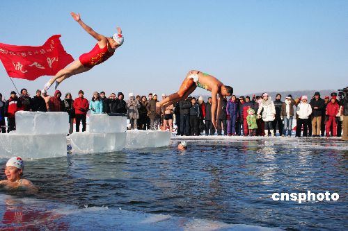 2009年1月1日,辽宁省沈阳市欢度新年暨全国“冬泳日”冬泳表演在棋盘山冰雪大世界秀湖举行。150多名冬泳爱好者进行了“天鹅湖”表演及跳水表演。中新社发 刘宝成 摄