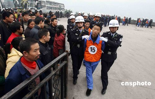1月16日,重庆市公安局将30名扒手分别押至该市渝中区朝天门、菜园坝长途汽车站、渝北区龙头寺汽车站等主城区4个人口密集地区,请市民辨认和举报。该市公安局方面称,这些扒手几乎都是惯扒,且全部是最近在他们作案时抓到的。之所以押到车站闹市,是希望曾经失窃的市民现场辨认和举报,同时也是警方对扒手作案现场的恢复、重建等系列案侦工作手段。中新社发 吴子敬 摄