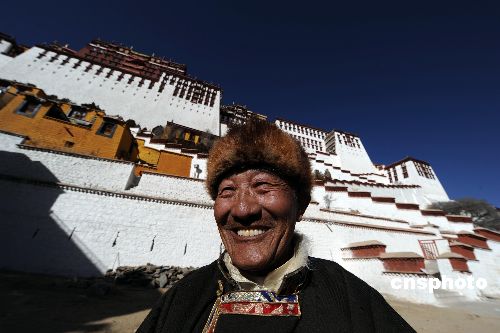 一月十九日,西藏立法机构通过一项议案,决定把每年三月二十八日设为西藏“百万农奴解放纪念日”,以纪念五十年前在西藏进行的民主改革。图为拉萨布达拉宫雪城前,现年七十三岁的昔日农奴益西洛追得知此讯表示非常高兴。中新社发 廖攀 摄