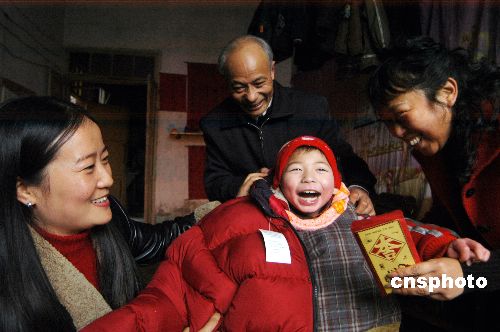 新年即将到来,四川省绵阳市民政局组织福彩中心、市梓潼儿童福利院开展“爱心助孤过年活动”,为家庭寄养孤儿送去慰问金、防寒服、水果、糖等年货。图为残疾人苏太金家,市民政局工作人员为寄养的7岁孤儿涪斌穿上防寒服。中新社发 成和平 摄