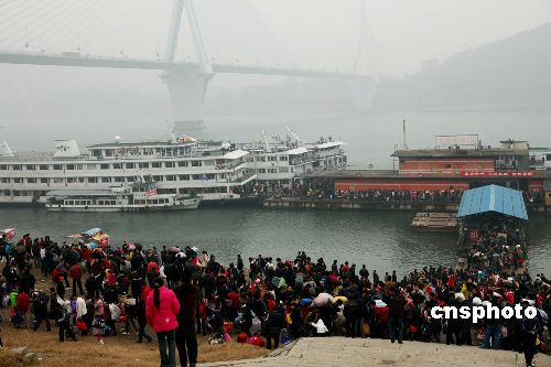 2月3日农历正月初九早8时,长江宜昌港大公桥客运码头四条趸船无一客人、无一客船,9时,9艘客船同一船闸、同时停泊宜昌港,一时间,涌入宜昌港口的出川大军疏散成“井喷”之势。宜昌海事、公安、港口等部门联动执法,35分钟时间内紧急疏散4500余人,全部是出川农民工。据统计,三峡春运期间,常年旅客进出客流量约50万人次,其中外出农民工乘船超过40余万人次。据悉,三峡库区是长江干线跨省春运重点航线,而这一航线又是中国内河农民工乘船的专营航线,节前单边返乡过年,节后单边出川进城打工,客船单边旅客、客船高度集中,是中国内河不多见的春运现象。中新社发 望作信 摄