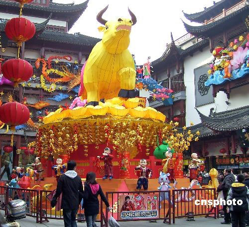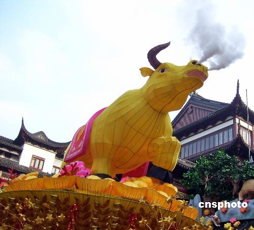 2009年2月6日,一个长7米、高3米的巨型“牛灯”在上海豫园元宵灯会上闪亮登场。“牛灯”的鼻孔还会冒烟,以应和“牛气冲天”的寓意。中新社发 井韦 摄