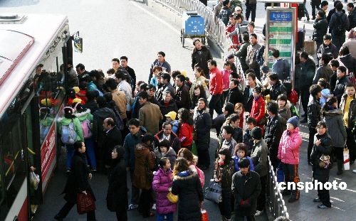 2009年2月16日,北京西站再次迎来客流高峰,抵京的乘客“挤爆”火车站外的公交车站。在返京的客流中,学生流占据了返程的主导。中新社发 任丘 摄