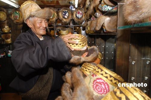 2月22日,藏历新年马上就要到了,65岁的老人多吉专门来到西藏拉萨八廓东街一家金毡帽店铺为自己选购帽子。他说,如今生活条件好了,生活水平也逐渐提高,能够在晚年享受这美好时光,他感觉非常幸福。中新社发 龙昊 摄