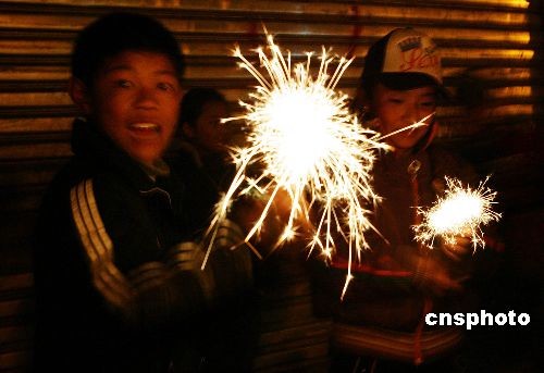 2月23日晚,拉萨城鞭炮齐鸣,灯火通明,街头到处是燃放烟花的孩子。今晚是藏历二十九的“古突”节,一般都要吃“古突”(即面圪瘩)和作驱邪的活动,人们走上街头燃放烟火,象征除旧立新,消灾免祸。中新社发 刘震 摄