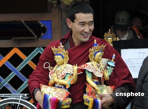 2月24日,中国藏历年三十,西藏拉萨大昭寺僧人愉快地接待请佛信众。中新社发 廖攀 摄