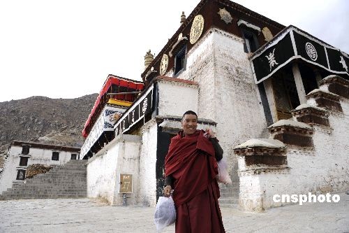 2月24日,藏历年三十,拉萨哲蚌寺内一位喇嘛背着大包年货进入佛殿。中新社发 廖攀 摄