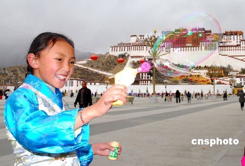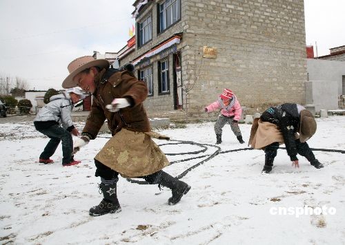 2009年2月25日,藏历土牛新年大年初一,藏族小朋友们穿着新衣服过大年。中新社发 张权 摄
