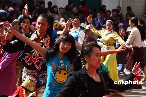 2月25日是藏历大年初一,在云南昆明工作学习的藏族民众聚在一起欢歌载舞迎接藏历新年。中新社发 刘冉阳 摄