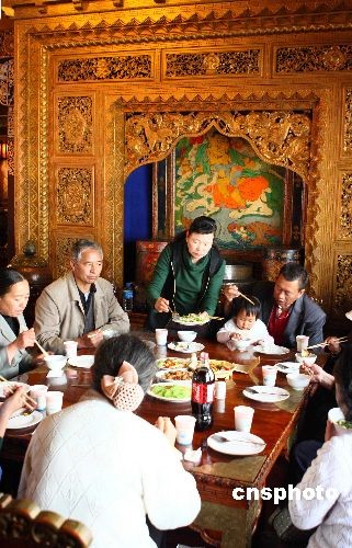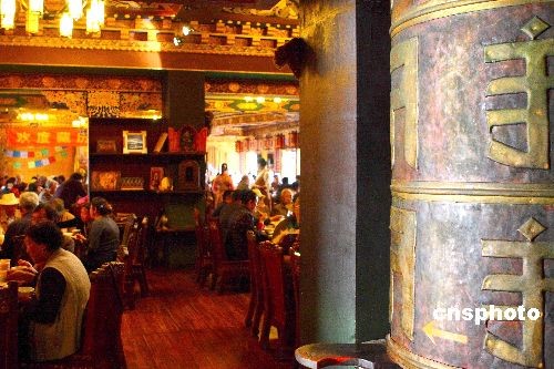 随着在昆明定居的藏族民众越来越多,独具特色的藏族饮食也越来越受到昆明市民的喜爱,酥油茶、青稞酒和牦牛肉这些来自藏区的绿色食品更是受到热捧。图为藏历新年期间,昆明最有名的“玛吉阿米香格里拉风情宫”藏式餐厅人满为患,昆明市民纷纷到此感受藏历新年的别样风情。中新社发 刘冉阳 摄
