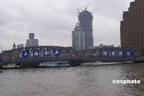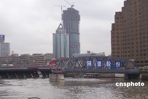 2月26日下午,上海外白渡桥南北两跨桥体正式合拢,离别10个月修缮的百年外白渡桥回到了苏州河。中新社发 周东潮 摄