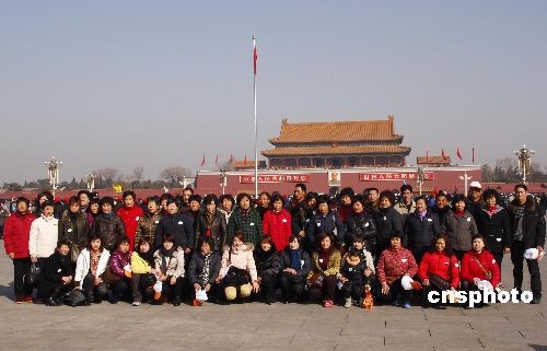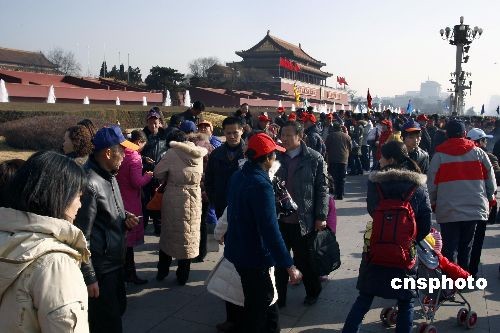 2月27日,全国“两会”召开前,北京天安门前喷泉开放,各地游客如织。中新社发 郑雄增 摄