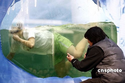 2月28日,“红牛勇闯南北极”大型探险勇士招募活动开始在新春的北京举行,应募市民在活动中挑战在冰水中憋气。在北京站招募比赛中顺利闯过三关、表现优异者,将有机会前往北极极点探险。“红牛勇闯南北极”大型探险勇士招募活动将在全中国海选出14位挑战者,送往中国内蒙古沙漠、瑞士阿尔卑斯冰川、挪威萨米人居住区等极地训练营展开集训,最终会有3人获得挑战北极点的最后通行证。而南极探险选拔活动将在下半年进行。中新社发 盛佳鹏 摄