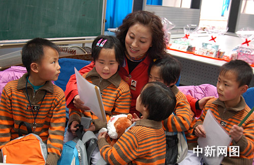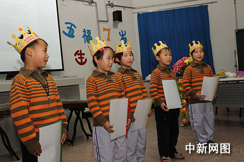 3月4日,在北京丰台区实验小学就读的河北沧州五胞胎缴福庆、缴福森、缴福莉、缴福欣、缴福源迎来7周岁生日,学校为他们举办了“快乐与感恩”主题班会。正在北京开“两会”的黑龙江省全国人大代表苏艳霞抽闲参加了生日会并向五胞胎赠送了生日礼物,7年来,苏艳霞女士一直关注着“五福娃”的成长。王少华 张书俭 摄