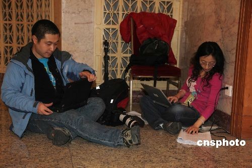 3月5日,十一届全国人大二次会议在北京人民大会堂开幕。图为在大会堂走廊上,采访大会的记者席地而坐,争取以最快的速度传送稿件。中新社发 张娅子 摄