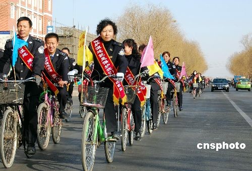 3月6日,甘肃张掖各界妇女代表近千人参加“保护湿地”环境保护主题宣传日活动。图为妇女自行车队沿街宣传。 中新社发 罗易祥 摄