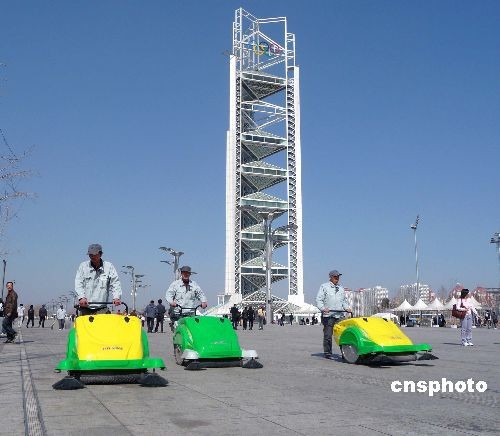 2009年3月8日,几名保洁员正在使用新型保洁车清扫北京奥林匹克公园的地面。据介绍,北京奥运中心区新近增添了6部手推保洁车,它操作起来轻便灵活,大大减轻了保洁人员的体力,提高了工作效率。中新社发 玉龙 摄