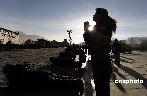 3月10日上午,西藏拉萨布达拉宫前的信众正在虔心祈祷,布宫广场气氛祥和。中新社发 廖攀 摄