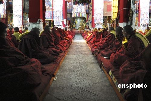 3月10日,西藏拉萨哲蚌寺,僧人们在措钦大殿诵经。中新社发 廖攀 摄
