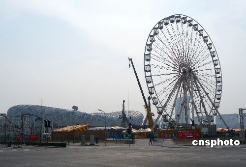 2009年3月10日,在北京奥林匹克公园“鸟巢”东北角,摩天轮、海盗船、太阳神车等在内的娱乐设施已经搭建完毕,目前正在加紧调试中,预计将于本月中旬开业迎客。据悉,此次嘉年华不同于前几年举办的环球嘉年华活动,包括包括海盗船等在内的40个机动游乐项目和56个竞技游乐项目会给游客耳目一新的感觉,而且随着季节的更替和游客喜爱程度的不同,这些大型游乐设施会定期替换。中新社发 玉龙 摄