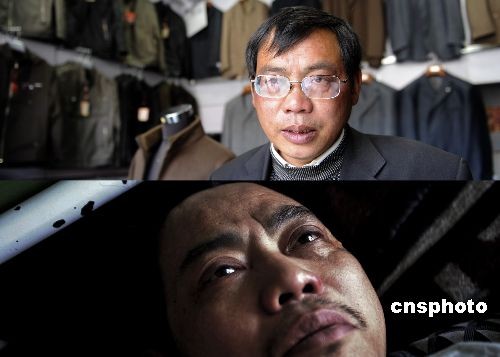 3月14日,西藏拉萨朵森格路,湖南商人刘国兵在其商铺里经营服装生意。一年前,刘国兵十九岁的女儿被烧死在商店内,自己也身受重伤。图为如今继续经商的刘国兵与一年前躺在医院病床上的刘国兵资料图片。中新社发 廖攀 摄